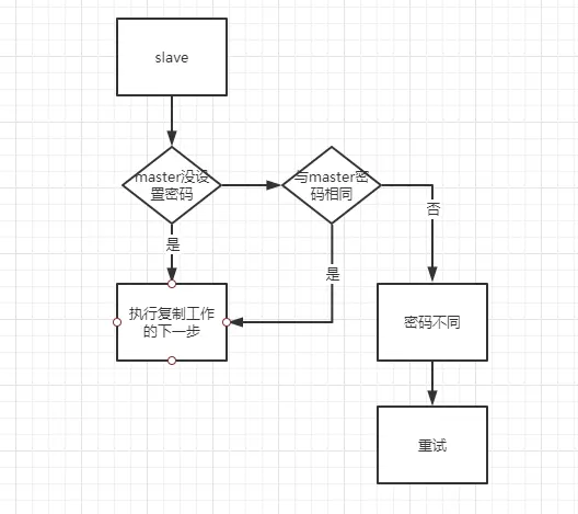 - 主服务没有设置 requirepass 选项,并且 slave 也没有设置 masterquth 选项,那么 master 继续执行 slave 命令,完成复制工作