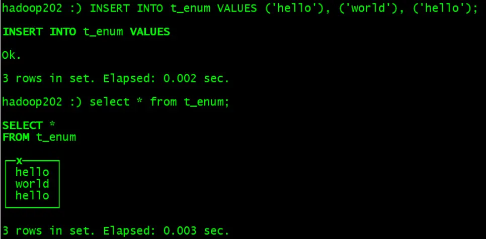INSERT INTO t_enum VALUES ('hello'), ('world'), ('hello');