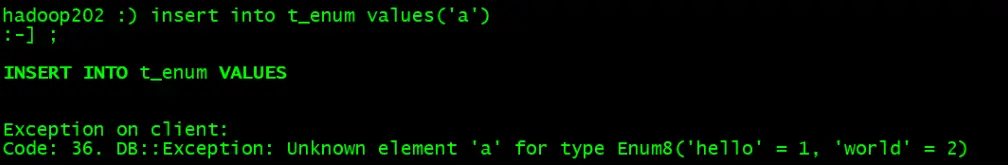 这个 x 列只能存储类型定义中列出的值:'hello' 或 'world',如果尝试保存任何其他值,ClickHouse 抛出异常。