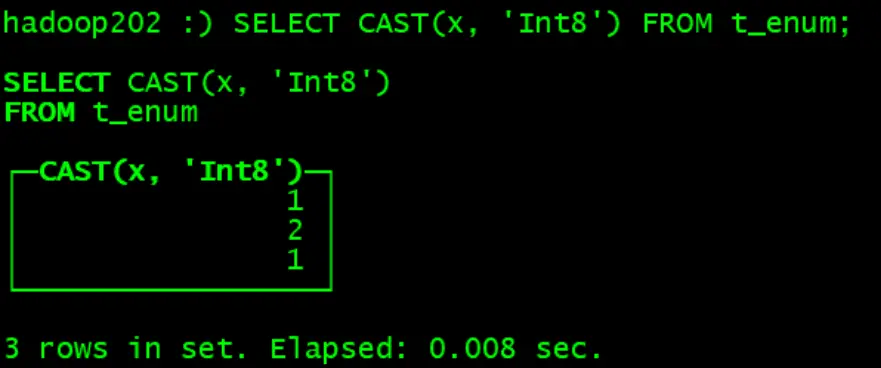 例如:创建一个带有一个枚举 Enum8 ('hello' = 1, 'world' = 2) 类型的列,并插入数据