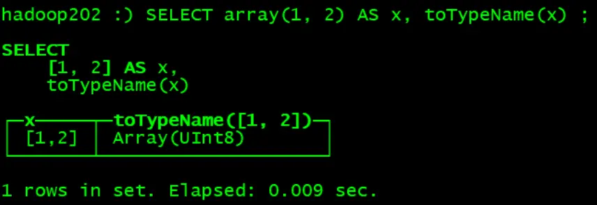 第一种创建数组的方式,as x,把数组起一个变量, toTypeName (x) 并打印出 x 变量的类型