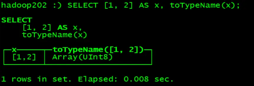 SELECT \[1, 2\] AS x, toTypeName(x);