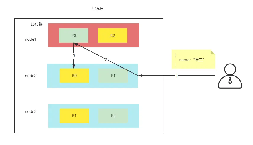 P 代表着分片,R 代表着副本,从图中可以看出有 2 个分片,每个分片在不同的节点上,而一个节点上有其他分片的副本,ES 为内部会把分片和副本均匀的散在节点上。具体写流程如下:
