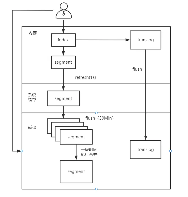 - 每隔一段时间,更多的文档被添加到内存缓冲区和追加到事务日志(translog),之后新 segment 被不断从内存缓存区被写入到文件缓存系统,这时内存缓存被清空,但是事务日志不会。随着 translog 变得越来越大,达到一定程度后索引被刷新,在刷新(flush)之后,segment 被全量提交(被写入硬盘)。