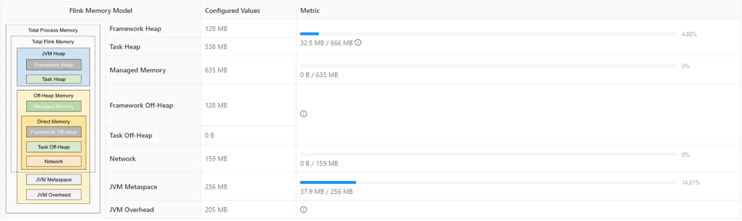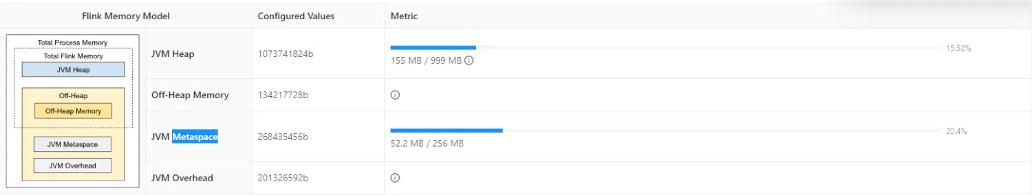 - jobmanager.memory.jvm-metaspace.size:默认值:256mb ,对应到图中的 JVM Metaspace。JobManager JVM 进程的 Metaspace。