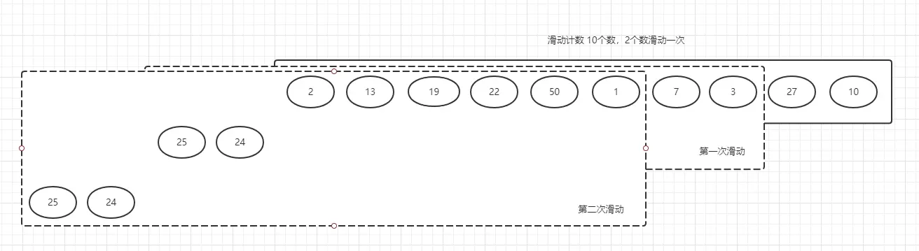 我们会想滑动计数,应该是 10 个数,来 2 个滑动一次,但实际流操作中,当你输入 2 个数,就会输出一次,如下: