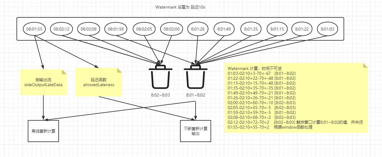 那对于乱序数据我们就可以使用 Watermark,我们来举个例子说明 flink 中的 Watermark 是什么:比如定点 9 点上车,但是往往有人 9.01 才来,那 Watermark 的做法就是把自己的时间调慢,也就是 8.59 分,9.01 的人来了 对于我来说还是 9 点。如果有人 9.02 来了,那其实可以配合 window 的延迟,我先输出数据开车,你来弯道超车,然后我重新计算输出新数据,但非有人,9.03 来呢,那我不管你了,我开车上高速,你可以坐下一辆车(侧输出流)。