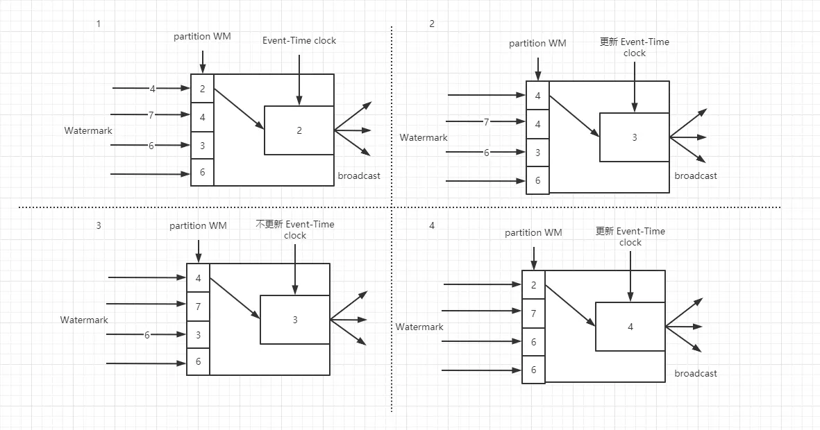 Watermark 在分区中会计算最小事件时钟,保证下游数据收到每个事件时钟,并根据自己的时钟得出是否计算结果并关闭窗口。Watermark 是以广播的形式把事件时钟传递给每个下游。