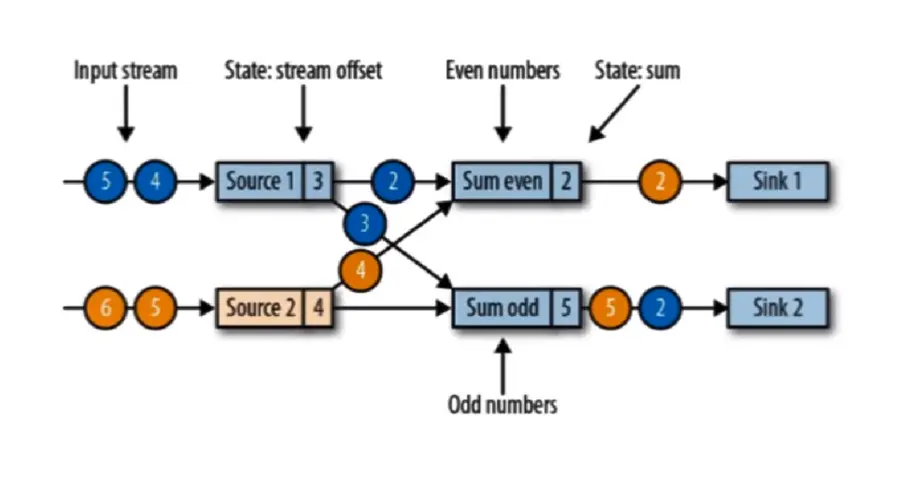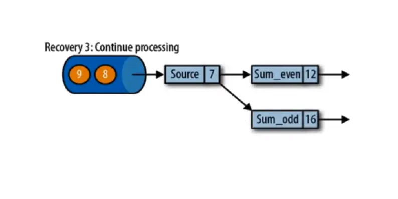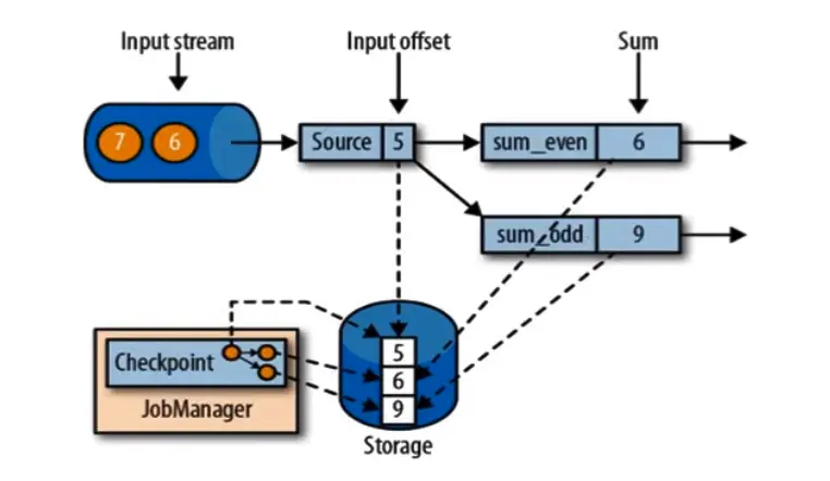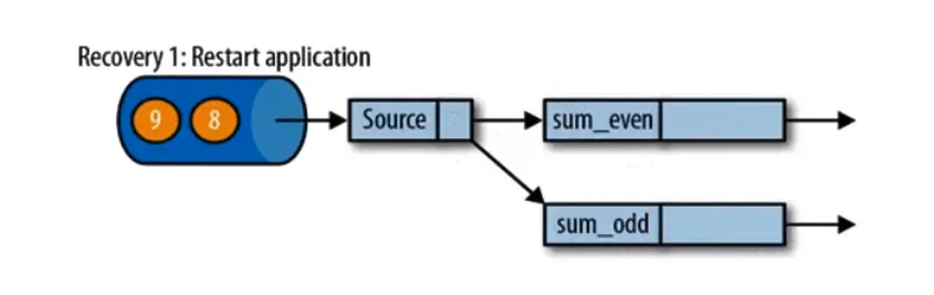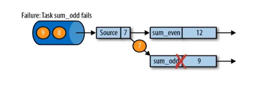 input stream = [1,2,3,4,5,6,7,8,9],sum_event = 求偶数和,sum_odd = 求奇数和,类似于于 source 到来的数据后 keyBy (data%2)。如果说 5 还没有被分配到 sum_odd 任务中,其实 sum_odd 应该还是 4=1+3,此时 5 在路上,source=6,突然挂掉,那么,storage 记录的要么是 source=6 sum_event =6 sum_odd =9,要么是 source=5 sum_event =6 sum_odd =4,它必须记录的是任务处理完成的状态,不是说 5 在路上没了你存的是 6 6 4,那么恢复肯定是错的,不如重新算一遍。