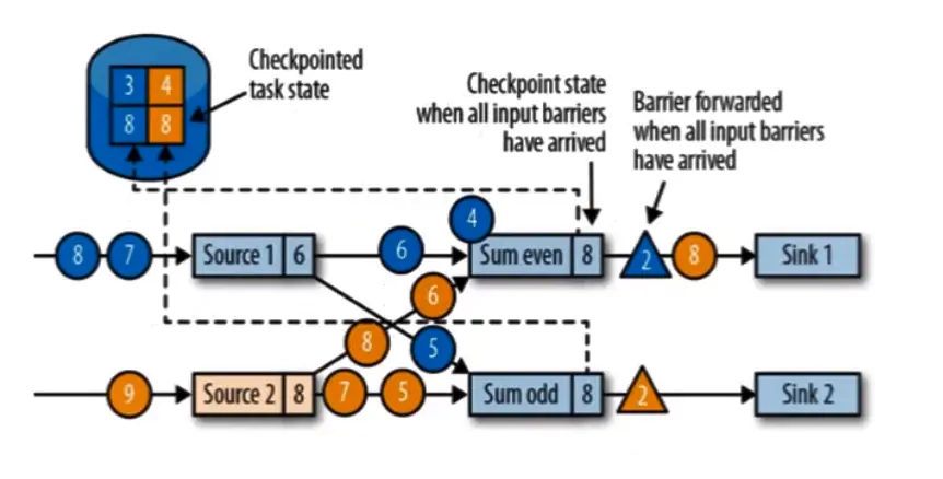 当收到所有输入分区的 barrier 时,任务就将其状态保存到状态后端的检查点中,然后将 barrier 继续向下游转发。任务 和 sink 会直传。