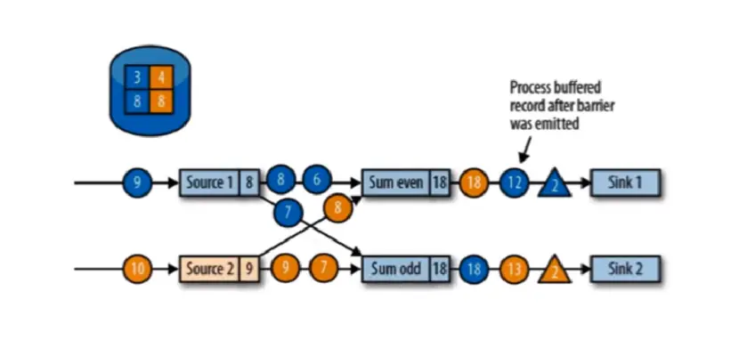 现在有两个输入流的应用程序,用并行的两个 source 任务来读取。sum_even = 黄 2,是因为 even (偶数) 接收到黄 2,odd (奇数) 输出蓝 2 和黄 5,它接收到的规律是先接受到 黄 1,加蓝 1 = 输出状态蓝 2,加黄 3 = 输出状态 黄 5。此时 黄 4 和 蓝 2,3 还在路上,source 的 offset 记录这 3 和 4。