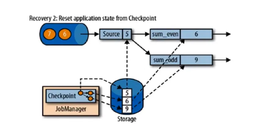 第二步是从 checkpoint 中读取状态,将状态重置。source 会记录消费数据的偏移量,从 storage 恢复的数据不一定是最近的一次计算,所以 source 记录的偏移量(offset)会恢复数据重新计算部分结果。