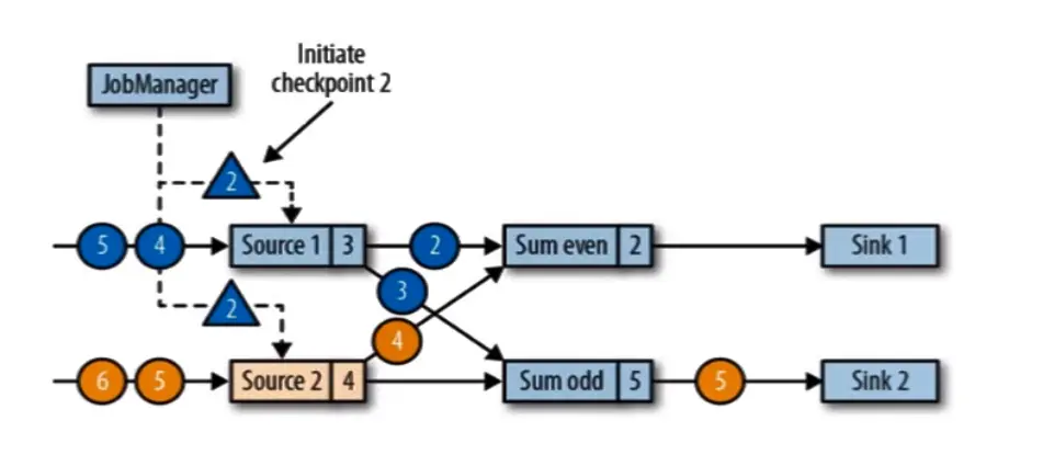 JobManager 会向每个 source 任务发送一条带有新检查点 ID 的消息,通过这种方式来启动检查点。检查点被分配到 source1 数据的 3 和 4 之间,source2 数据的 4 和 5 之间,此时上一步的黄 2 和蓝 2 都被输出掉。