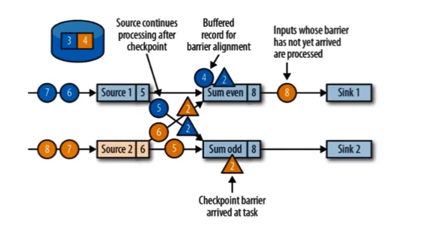 等到所有的 barrier 到齐称为 分界线对齐:barrier 向下游传递,sun 任务会等待所有输入并行的 barrier 到达,对于 barrier 已经达到的,继续到达的数据会被缓存,而 barrier 尚未达到的,数据会被正常处理,只会处理 barrier 之前的数据。
