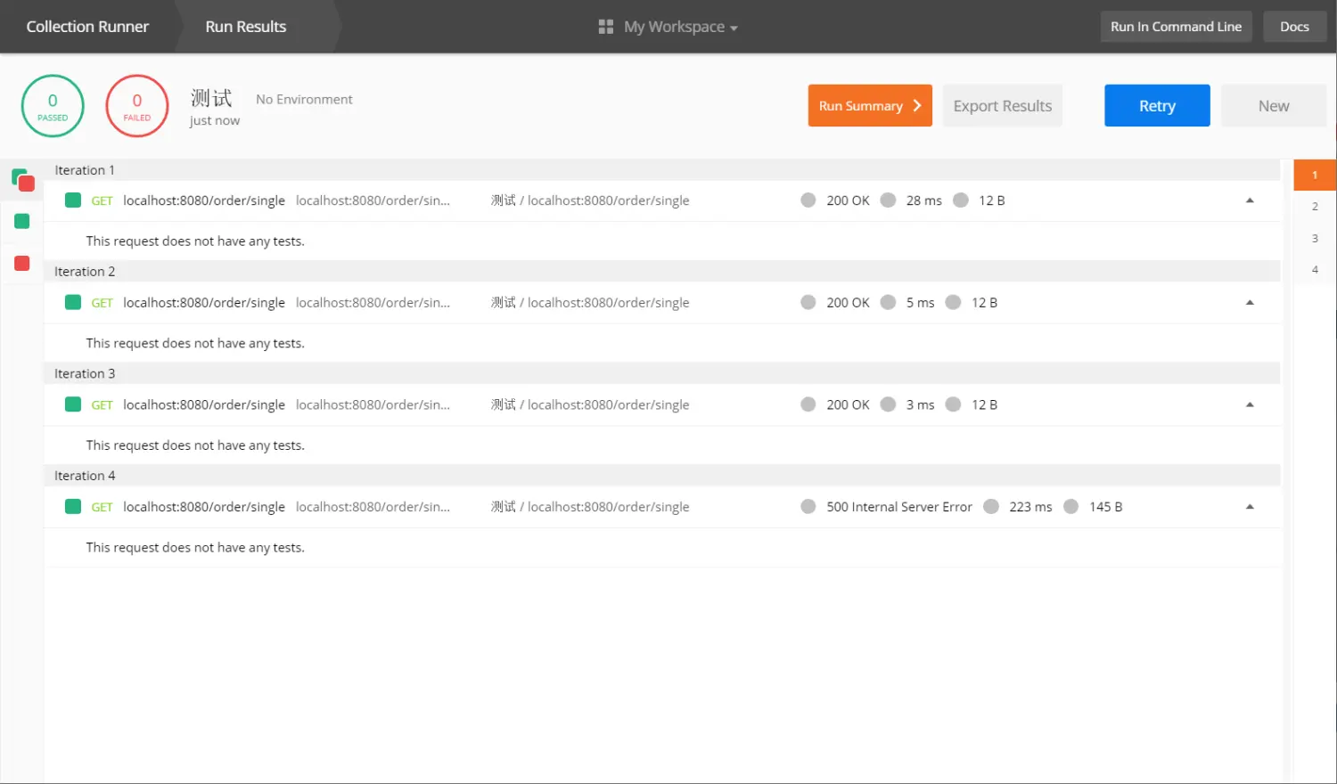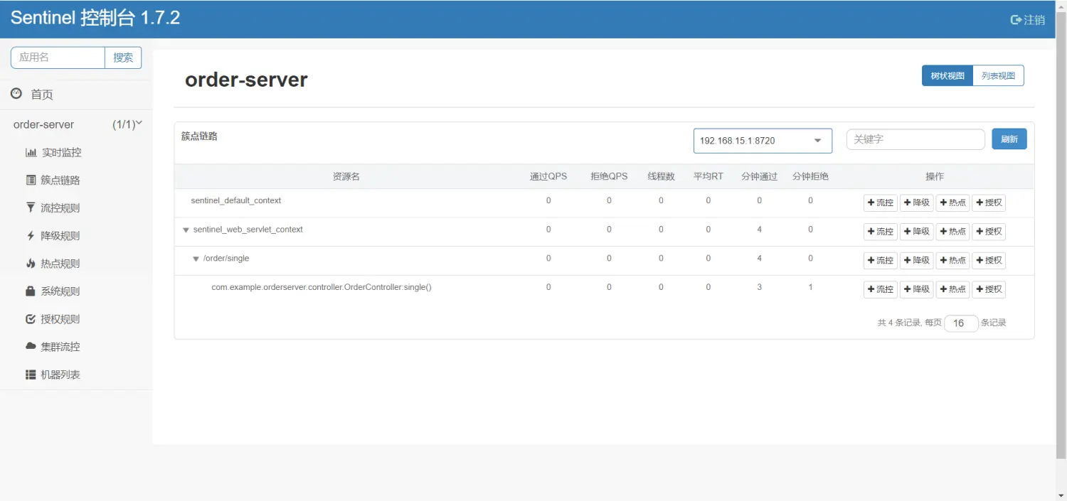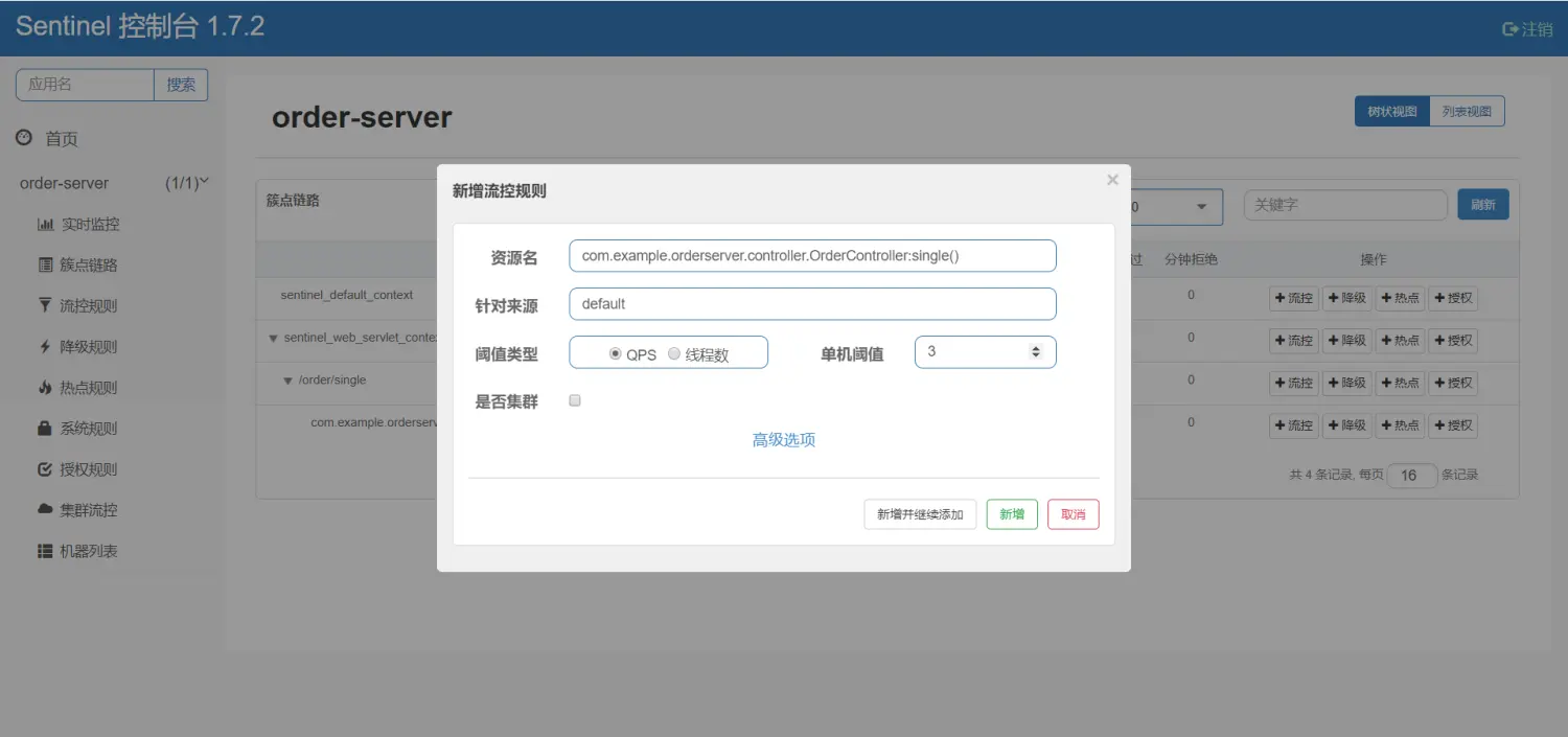 以上测试为限制 single 接口的 qps 为 2,实际测试数量为 4,通过 3 个请求,拒绝 1 个请求。