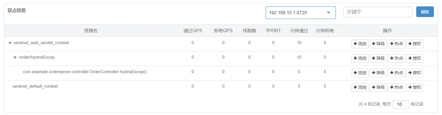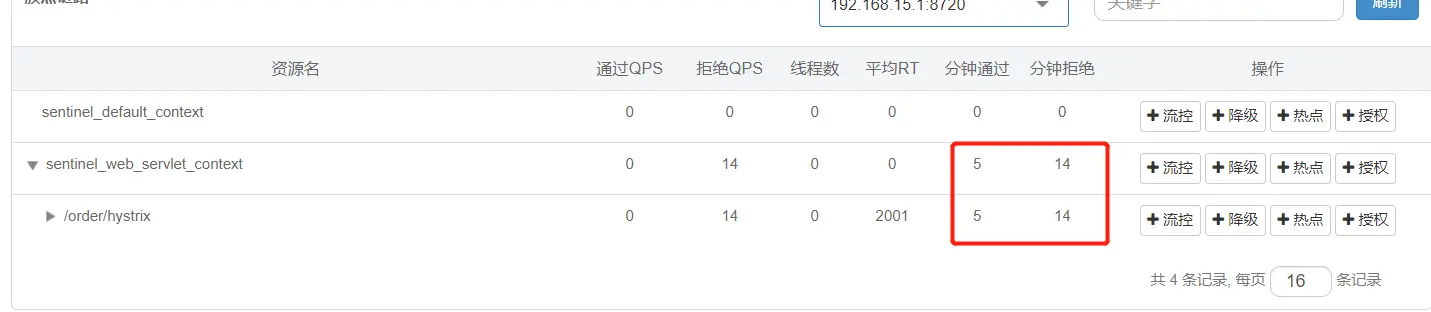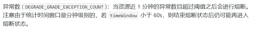 异常数是很好理解的,和异常比是相似的。假设 1 分钟内有 100 个请求,100 个请求中有部分请求发生异常,且 1 分钟内异常数刚好 >= 设置的阈值,则其余请求均被拒绝,拒绝的请求还是有走定义的熔断异常方法。