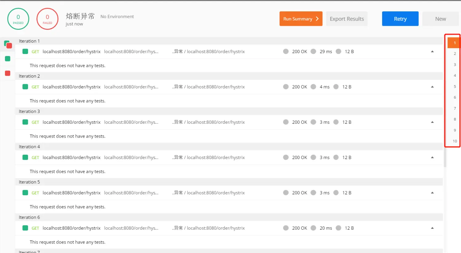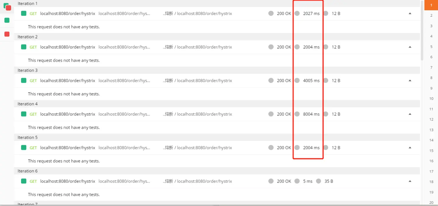 上图可以看出,我设置 hystrix 接口要被请求 20 次,当响应时间在 规定时间 内的平均值大于设置的阈值 (RT:2000ms),则拒绝所有请求。时间窗口 的意思是,若发生熔断则特定时间内的所有请求均被拒绝,直到时间窗口数值耗尽才开始接收请求。