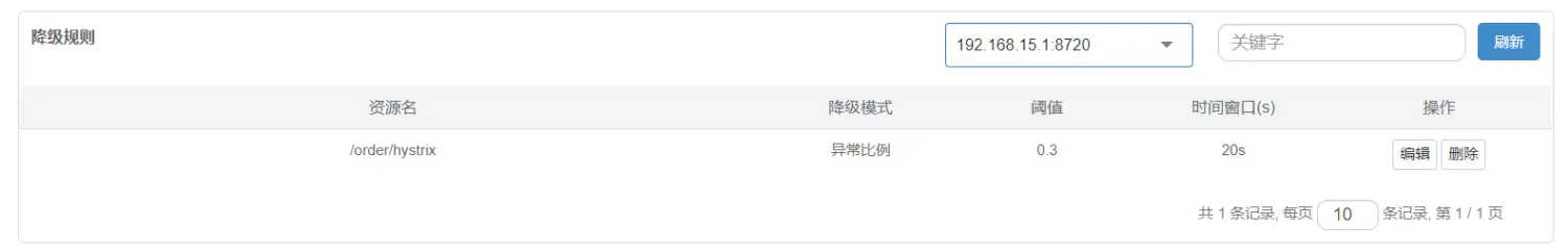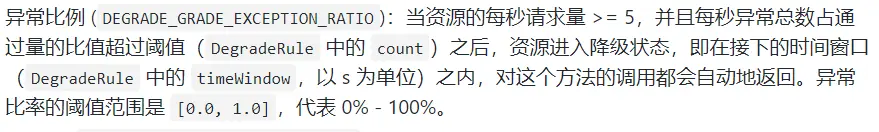 假设 1 秒有 10 个请求,我的异常比是 30%,那就是只要有 3 个请求发生异常,其他请求均被拒绝,拒绝的请求还是有走定义的熔断异常方法。