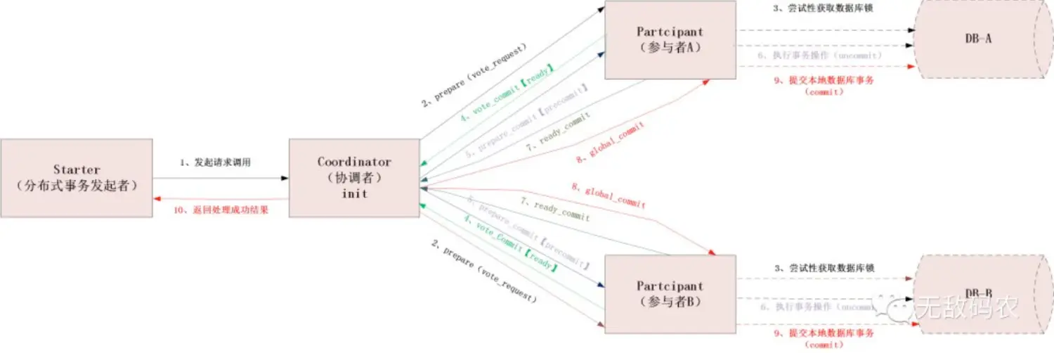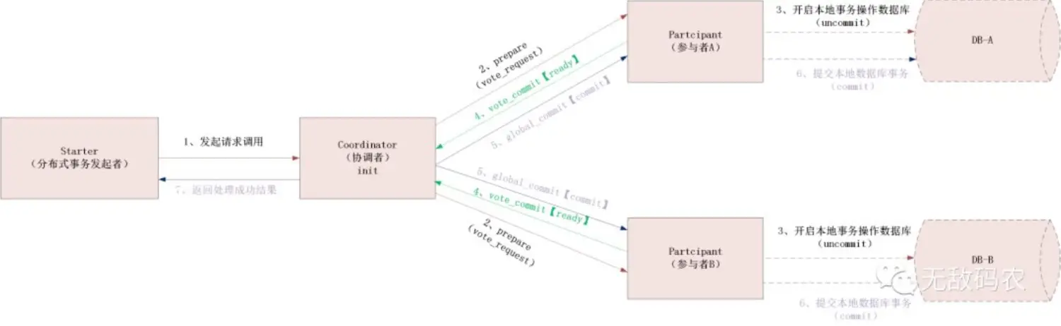 如果所有参与者节点都向协调者报告说 “我这边可以处理”,那么此时协调者就会向所有参与者节点发送 “全局提交确认通知(global_commit)”,即你们都可以进行本地事务提交了,此时参与者节点就会完成自身本地数据库事务的提交,并最终将提交结果回复 “ack” 消息给 Coordinator,然后 Coordinator 就会向调用方返回分布式事务处理完成的结果。