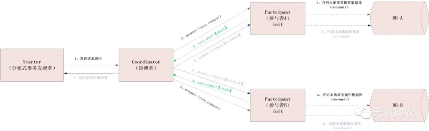 相反,在第二阶段除了所有的参与者节点都反馈 “我这边可以处理了” 的情况外,也会有节点反馈说 “我这边不能处理” 的情况发生,此时参与者节点就会向协调者节点反馈 “Vote_Abort” 的消息。此时分布式事务协调者节点就会向所有的参与者节点发起事务回滚的消息(“global_rollback”),此时各个参与者节点就会回滚本地事务,释放资源,并且向协调者节点发送 “ack” 确认消息,协调者节点就会向调用方返回分布式事务处理失败的结果。