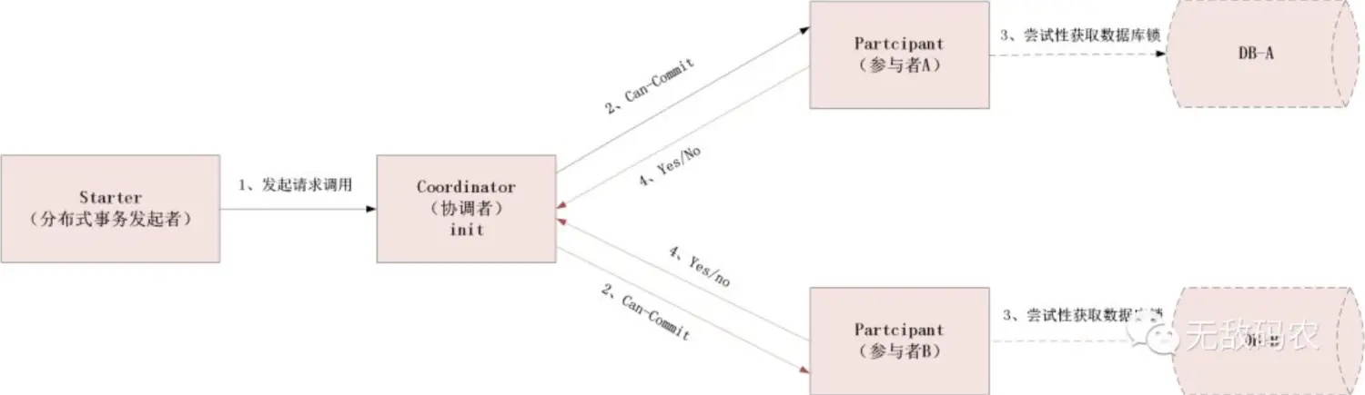 就是在分布式事务的发起方在向分布式事务协调者(Coordinator)发送请求时,Coordinator 首先会分别向参与者(Partcipant)节点 A、参与这节点(Partcipant)节点 B 分别发送 事务预处理请求,称之为 Prepare,有些资料也叫 "Vote Request"。