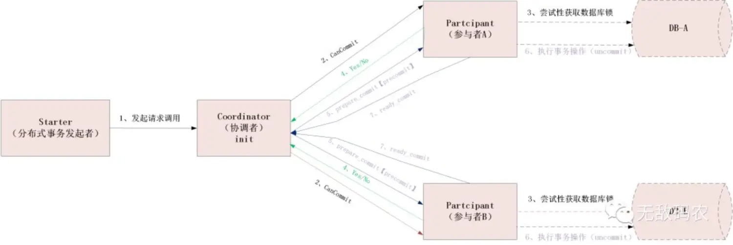 但是性能问题和不一致问题仍然没有根本解决。下面我们还是一起看下三阶段流程的是什么样的?