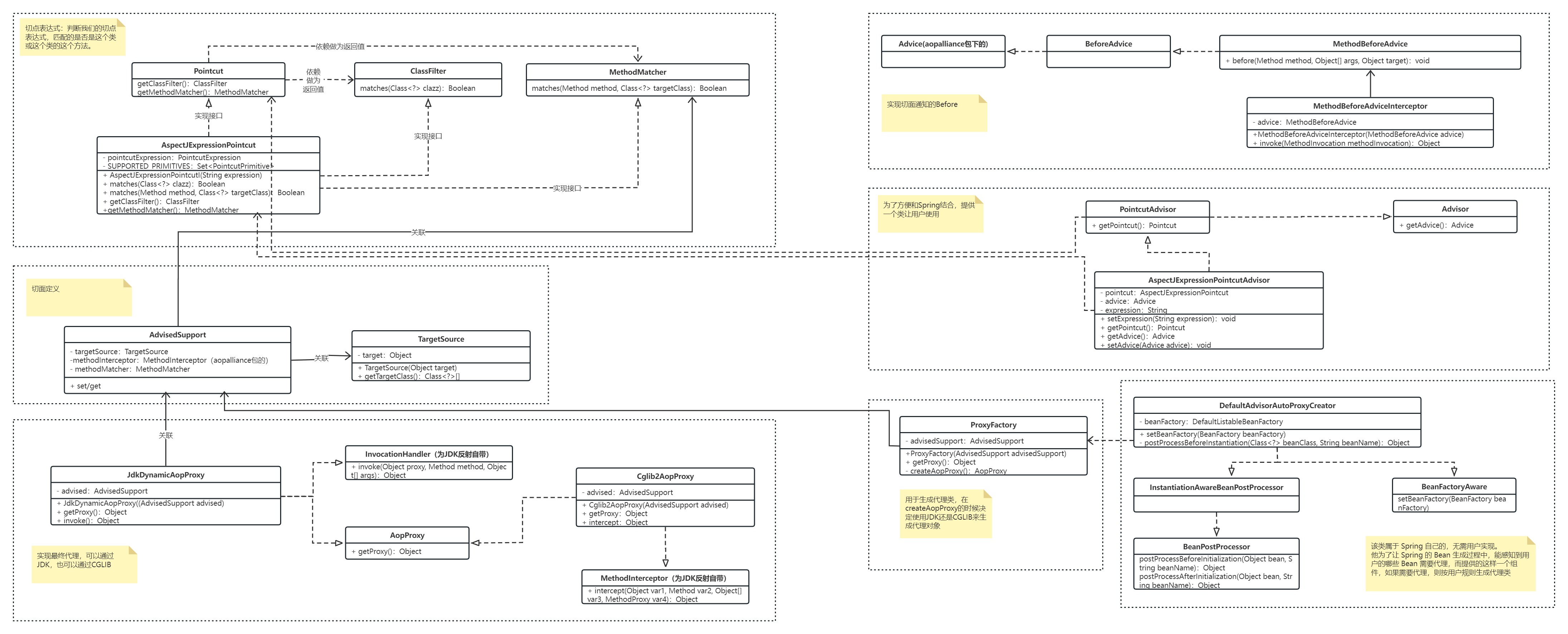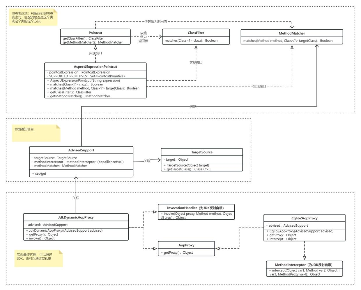 - 切面:切面是一个模块化的横切关注点,在这里我们可以视为没有显式定义的切面。而是直接在 InvocationHandler.invoke () 中实现了拦截和增强逻辑,包括方法匹配器、方法拦截器和反射调用等。