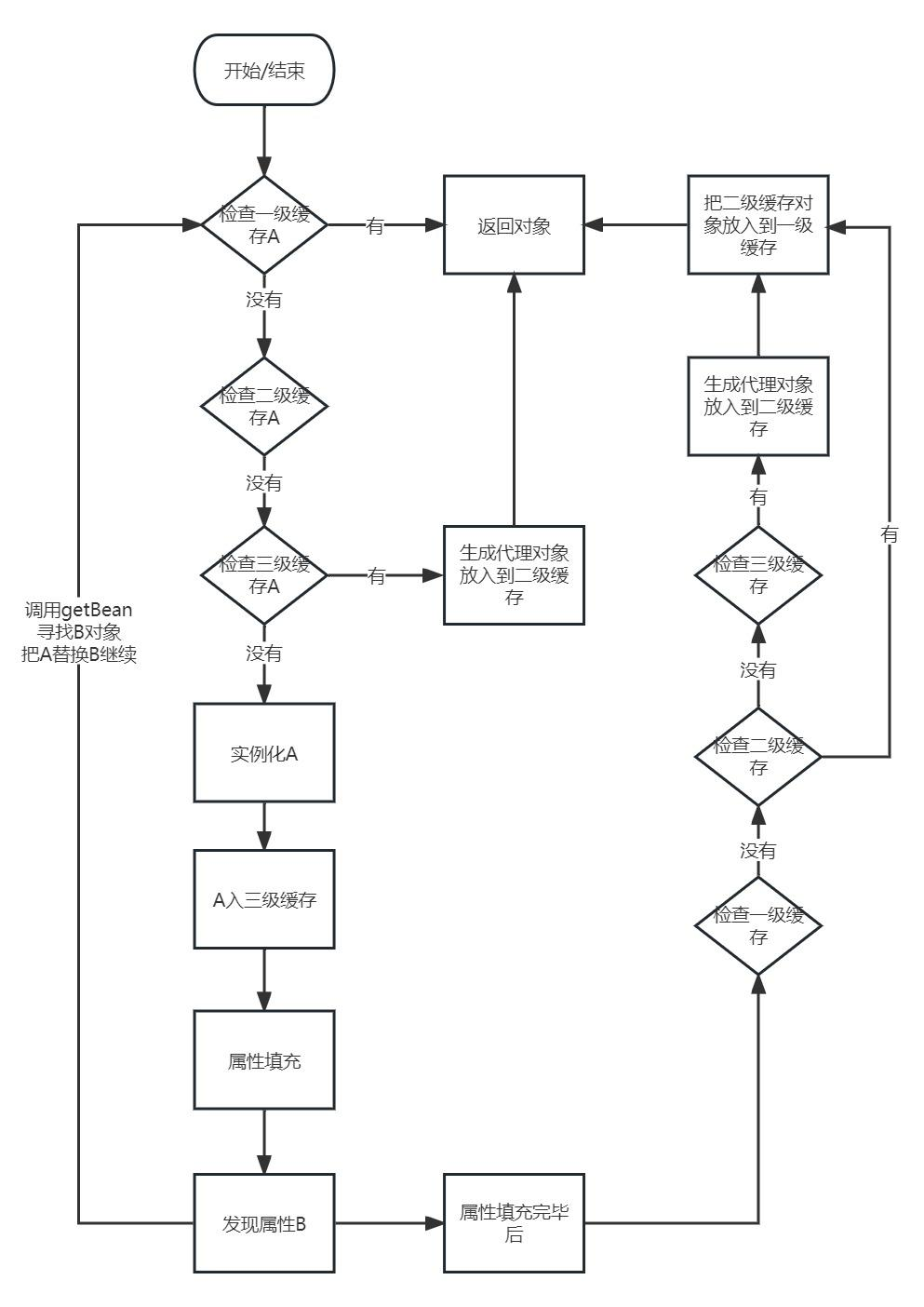 - singletonFactories(三级缓存,半成品对象也是工厂对象):单例工厂缓存区域存储创建 bean 实例的 ObjectFactory。在 Bean 依赖关系的创建过程中,如果 A 依赖 B,B 又依赖 A,那么在创建 A 和 B 的过程中就会出现循环依赖的问题。Spring 就是通过提前暴露一个未完成初始化的 Bean 来解决这个问题的。