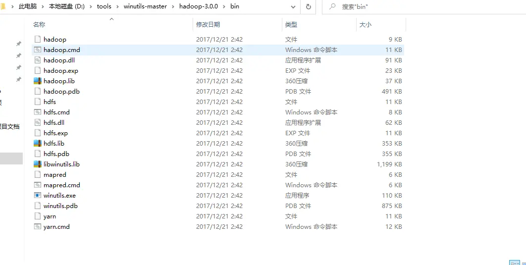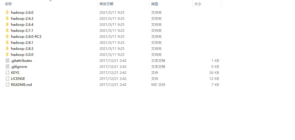 我使用的不是直接在 Hadoop 官网下载的和安装的 hadoop 对应 hadop 版本的解压包,我是用 winutils-master 的,包整个大小只有 6M 左右,里面提供了对 hadoop 在 windows 上的支持,3.x 以上使用 3.0.0 就行,下载可以在网上搜索 winutils-master 或 winutils。