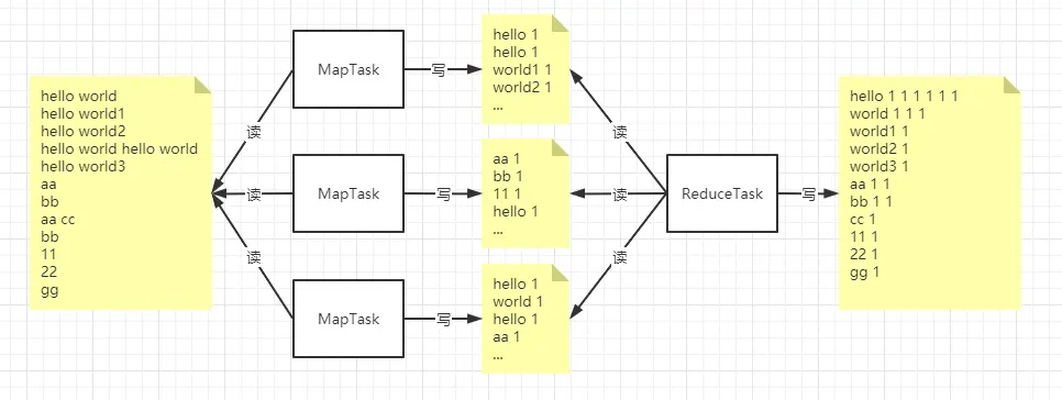 - ReduceTask 读取 MapTask 的输出做为输入,会得到 一个迭代器,迭代器包含了相同单词的 value(最后图中的 hello 1 1 1 1 1 1),迭代器中包含 6 个元素,每个元素的值都是 1.