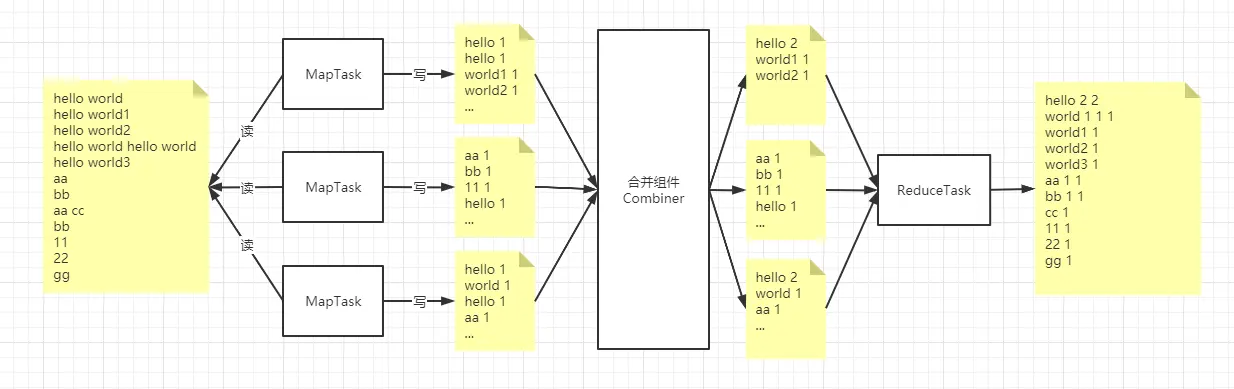 我们可以看到 合并组件 提前把 MapTask 的的输出做为输入合并后再输出,引入 Combiner 的作用就是为了降低 ReduceTask 的负载。