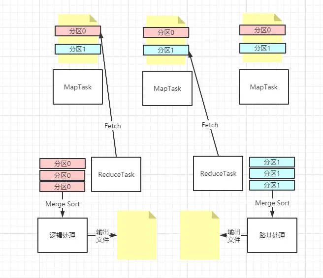 ReduceTask 会把 MapTask 输出的文件按分区读取再合并排序,该分区和 ReduceTask 的分区是两回事,MapTask 是对文件内容分区,ReduceTask 是对输出结果到不同的文件分区。