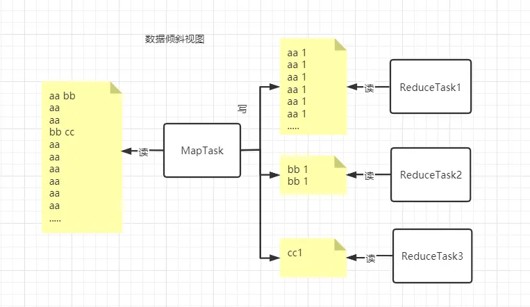 数据经过 MapTask 后,由于不同 key 的数据量分布不均,在 MapTask 阶段中通过 分区 将相同的 key 的数据 spill (溢写)写入磁盘,最后 merge 成最终 map 阶段输出文件,交由 ReduceTask 处理。如此一来 80G 的 aa 将发往同一个 reducer 。