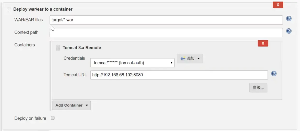 tomcat 凭证需要自己百度去配置以下,当你配置成功后,可以访问到 tomcat 的 IP:8080/manager/html 页面,配置完后回到 jenkins,部署远程 tomcat 的时候需要这个凭证。