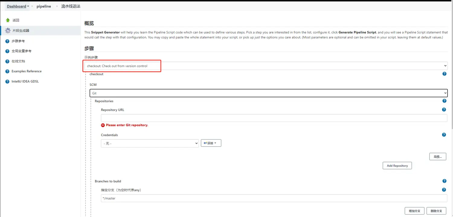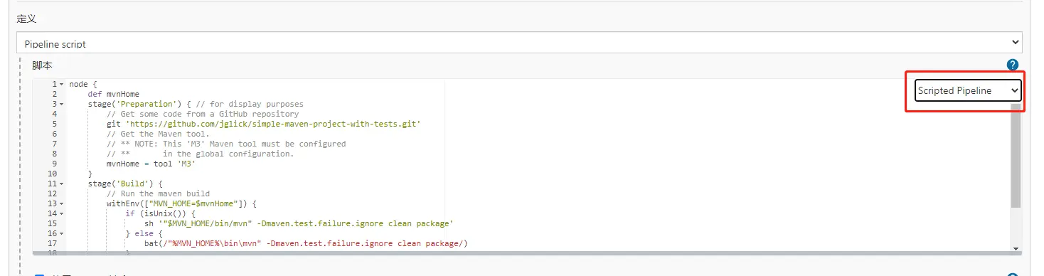- Pipeline 支持两种语法:Declarative (声明式) 和 Scripted Pipeline (脚本式) 语法,Scripted Pipeline 支持更多的 groovy 语言,不像前者受那么多的结构化限制。由于可以编写灵活的逻辑,可以认为是高级版的 pipeline,如果你想实现的逻辑比较灵活,比如有判断、分支,或者需要用 groovy 语言编写复杂的运行步骤,都应该选择使用 Scripted Pipeline。