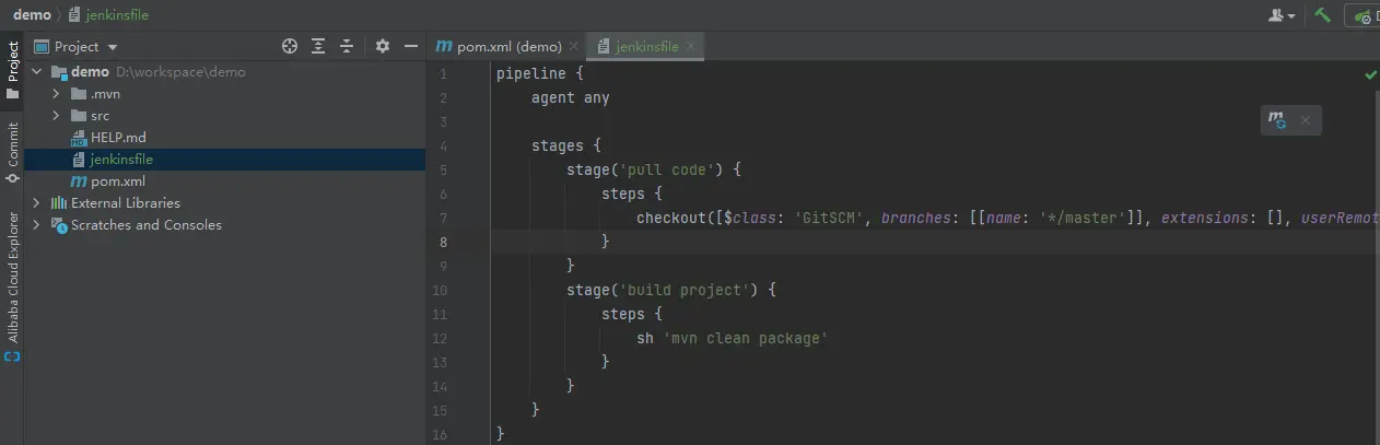 刚才我们都是直接在 Jenkins 的 UI 界面编写 Pipeline 代码,这样不方便脚本维护,建议把 Pipeline 脚本放在项目中(一起进行版本控制)
