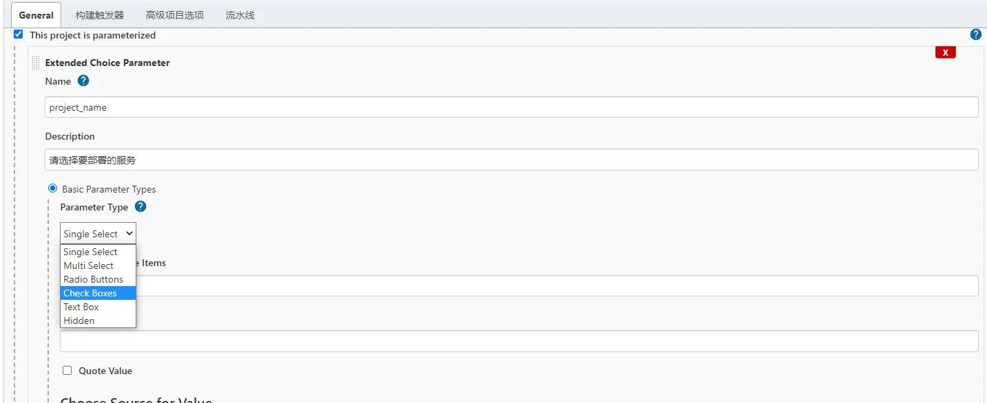 安装 Extended Choice Parameter 插件,到项目配置中,可以看到选择参数多了一个选项