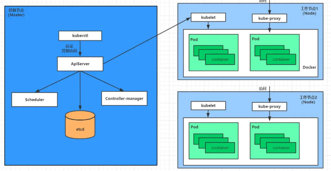 一个 kubernetes 集群主要是由控制节点 (master)、** 工作节点 (node)** 构成,每个节点上都会安装不同的组件。