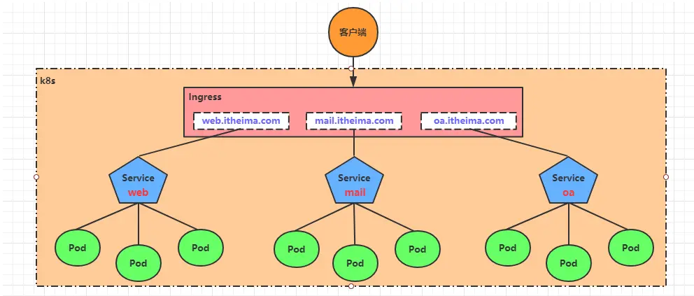 - 用户编写 Ingress 规则,说明哪个域名对应 kubernetes 集群中的哪个 Service