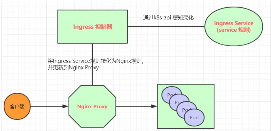 - Ingress 控制器动态感知 Ingress 服务规则的变化,然后生成一段对应的 Nginx 反向代理配置