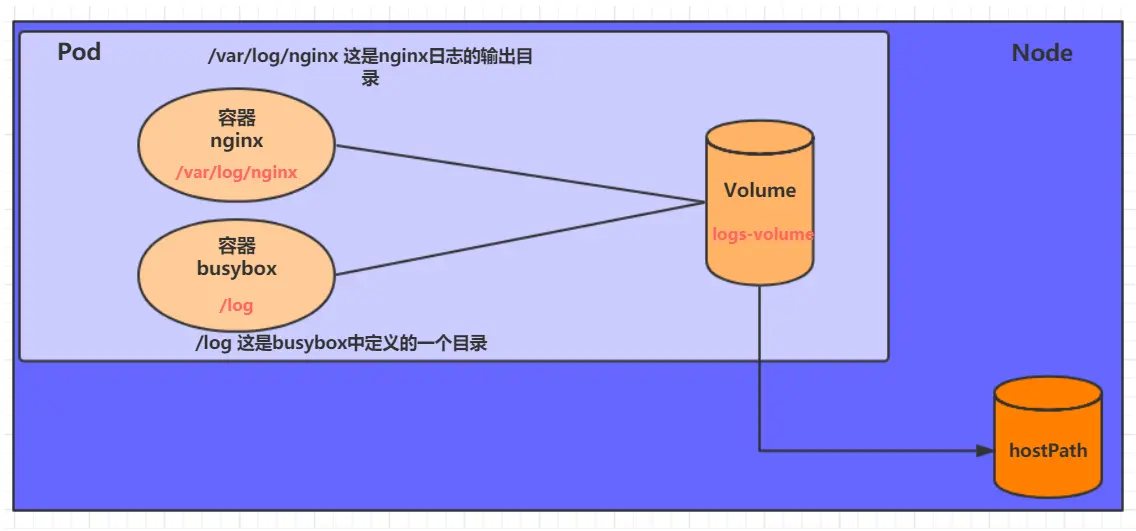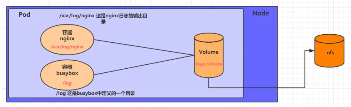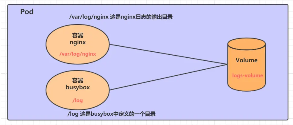 在一个 Pod 中准备两个容器 nginx 和 busybox,然后声明一个 Volume 分别挂在到两个容器的目录中,然后 nginx 容器负责向 Volume 中写日志,busybox 中通过命令将日志内容读到控制台。