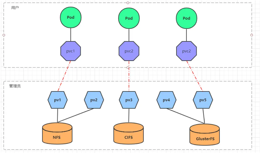 在用户定义好 PVC 之后,系统将根据 PVC 对存储资源的请求在已存在的 PV 中选择一个满足条件的- 一旦找到,就将该 PV 与用户定义的 PVC 进行绑定,用户的应用就可以使用这个 PVC 了