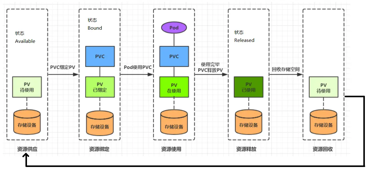 PVC 和 PV 是一一对应的,PV 和 PVC 之间的相互作用遵循以下生命周期: