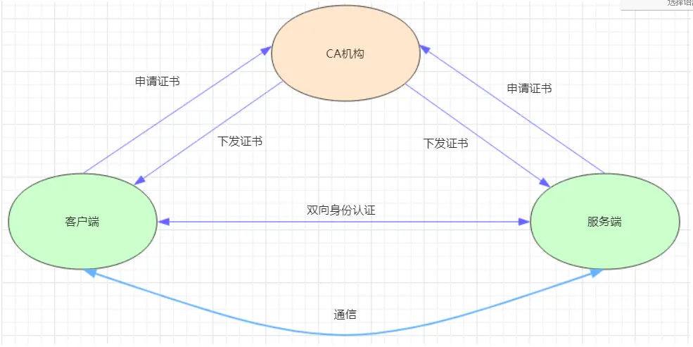 HTTPS 通信双方的服务器向 CA 机构申请证书,CA 机构下发根证书、服务端证书及私钥给申请者