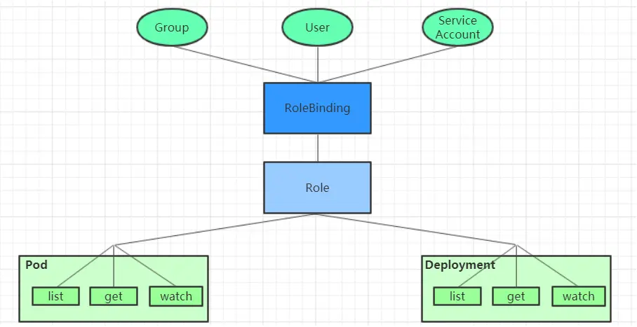 角色绑定用来把一个角色绑定到一个目标对象上,绑定目标可以是 User、Group 或者 ServiceAccount。