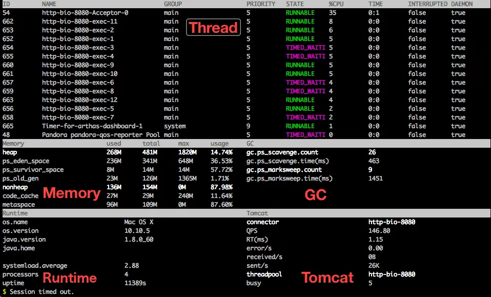 dashboard 当前系统的实时数据面板,按 ctrl+c 退出,当运行在 Ali-tomcat 时,会显示当前 tomcat 的实时信息,如 HTTP 请求的 qps, rt, 错误数,线程池信息等等。