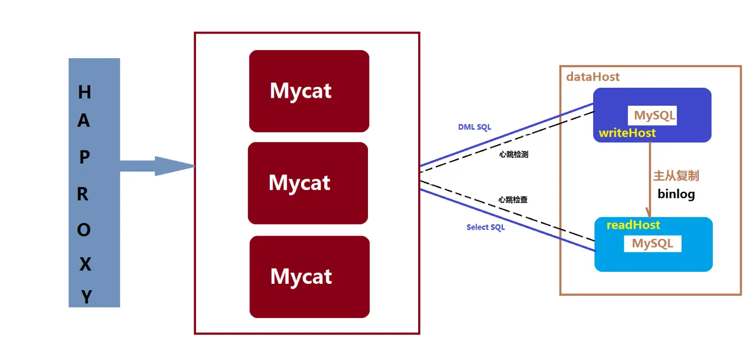 - haproxy 负责将对 vip 的请求分发到 mycat 上。起到负载均衡的作用,同时 haproxy 也能检测到 mycat 是否存活,haproxy 只会将请求转发到存活的 mycat 上。