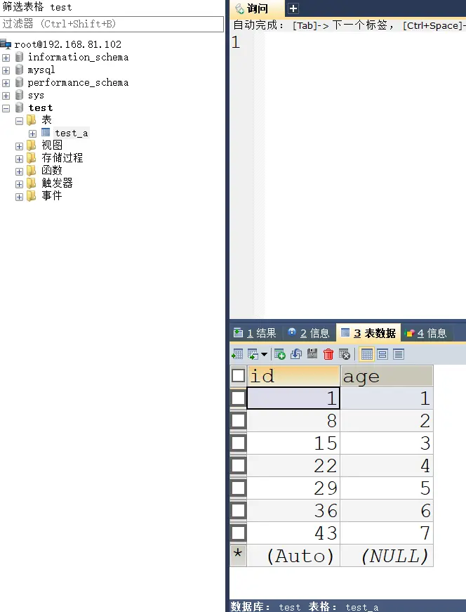 先向 mysql1 创建一个 test 库,看 mysql2 能否同步,然后创建表查看能否同步,再进行数据插入,看能否同步。