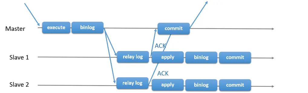 - 主库执行完事务后,同步 binlog 给从库,从库 ack 反馈接收到 binlog,主库提交 commit,反馈给客户端,释放会话;