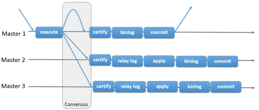 在 mysql 多主模式下,在组复制中通过 Group Replication Protocol 协议及 Paxos 协议 (一致性算法) (opens new window),形成的整体高可用解决方案,同时增加了 certify (认证) 的概念,负责检查事务是否允许提交,是否与其它事务存在冲突,Group Replication 是由多个节点共同组成一个数据库集群,每个节点都可以单独执行事务,但是 read-write(rw)的操作只有在组内验证后才可以 commit,Read-only (RO) 事务是不需要验证可以立即执行,当一个事务在一个节点上提交之前,会在组内自动进行原子性的广播,告知其他节点变更了什么内容 / 执行了什么事务,然后为该事物建立一个全局的排序,最终,这意味着所有的服务器都以相同的顺序接收相同的事务集。因此,所有服务器都按照相同的顺序应用相同的变更集,因此它们在组中保持一致。 在多主模式下,该组的所有成员都设置为读写模式,在多主模式下,不支持 SERIALIZABLE (严格的) 事务隔离级别,且不能完全支持级联外键约束。